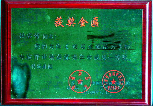 2004年6月,五絕指針療法創(chuàng)始人張寶增主任醫(yī)師的作品《結石癥的治療》,經中國管理科學研究院專家評審,榮獲優(yōu)秀學術成果一等獎;并頒發(fā)獲獎證書及獲獎金匾。