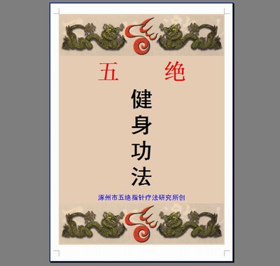 五絕健身功法,集打、壓、揉、擦、振手(指)法于一體,循人體體表之多部經脈穴位,上下左右,前后兼顧,以達陰陽平衡,根據穴位所在,又便于實施起見,由下而上依次進行不同的手(指)法動作,其數據脈所生,心之所動,又以大衍之數而定,古今醫學相參以合。其勁力適之自我,自身為之,以感覺舒適、輕松為度;所以,根據個人體質承受能力,勁大勁小由已而定,以不痛為宜,或以酸、脹、沉為達;整套動作連續完成,不得間歇;其穴、指、數更應準確,以得靈效。