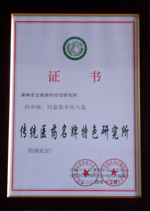 涿州市五絕指針療法研究所榮獲獎牌及證書