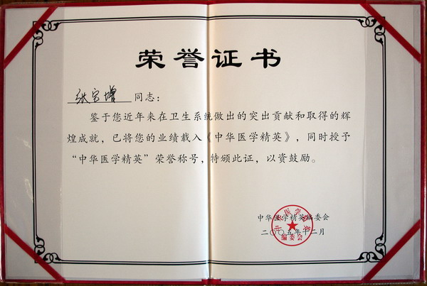 2005年12月,張寶增醫師業績載入《中華醫學精英》史冊,獲榮譽證書。