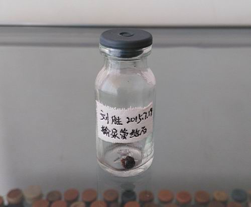 輸尿管結(jié)石圖片:這是一位輸尿管結(jié)石患者在采用五絕指針療法治療后排下的輸尿管結(jié)石標(biāo)本。結(jié)石體形狀不規(guī)則,呈紅褐色,質(zhì)地堅硬。